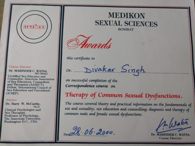 Being in practice for the last 18 years, Dr. Divakar Singh (B.A.M.S) and Sexual Therapist from Medikon Sexual Sciences (M.S.S) from Mumbai, is world famous Sexual Therapist. In his successfull career, he has treated lot of patients with confidence. Lot of patients from India and abroad contact him for medicines related to sexual problems like Pre-mature ejaculation, Low Sperm Count, Poor Erection, Infertility, Loss of Sexual Desire and many more sexual problems.